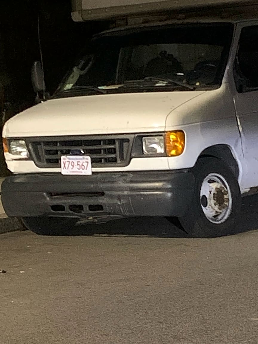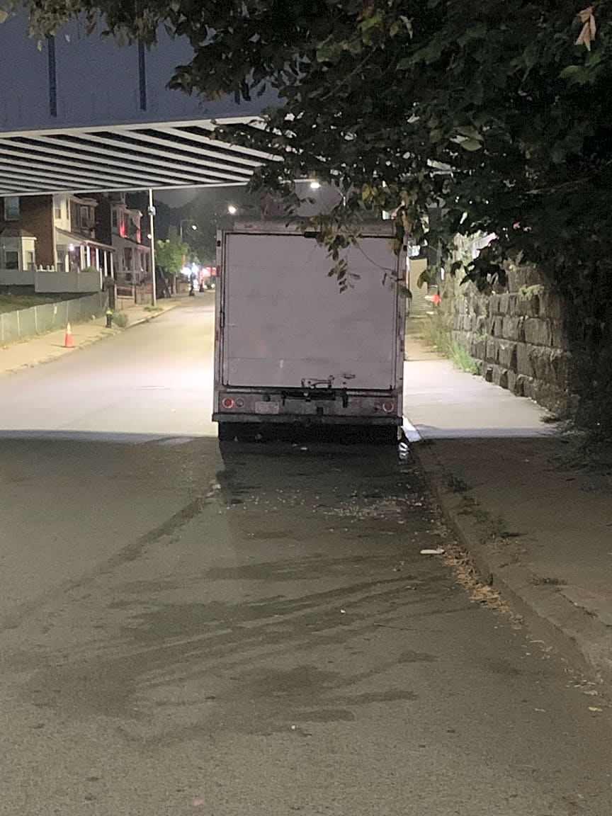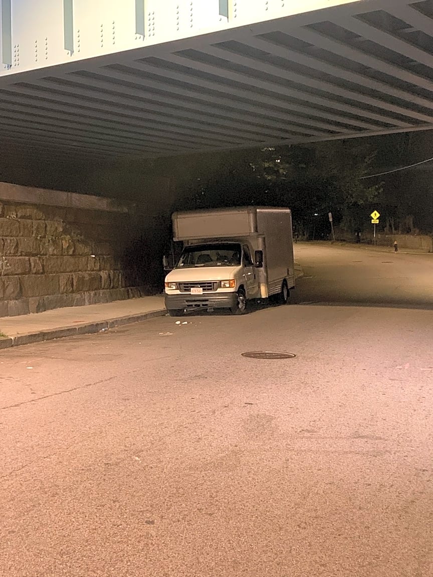 - Box truck parked overnight under bridge
