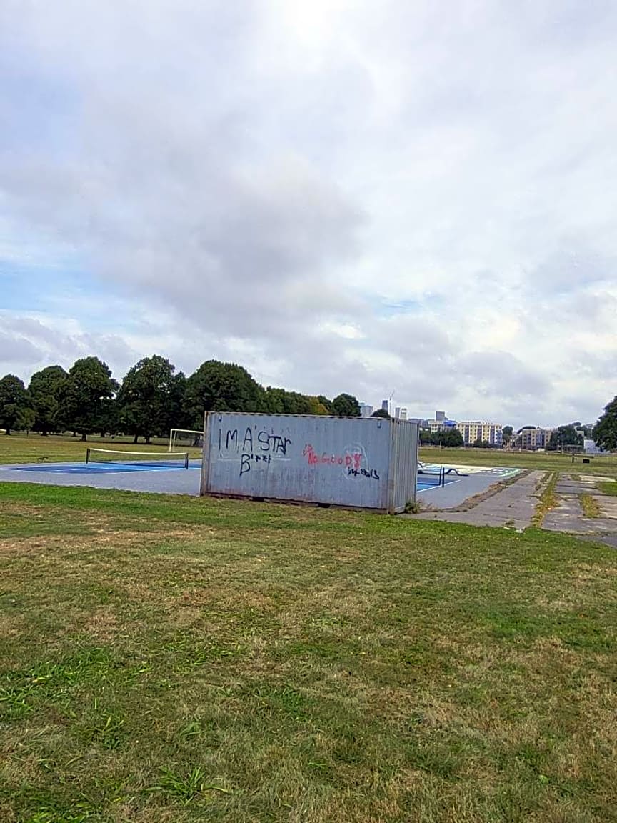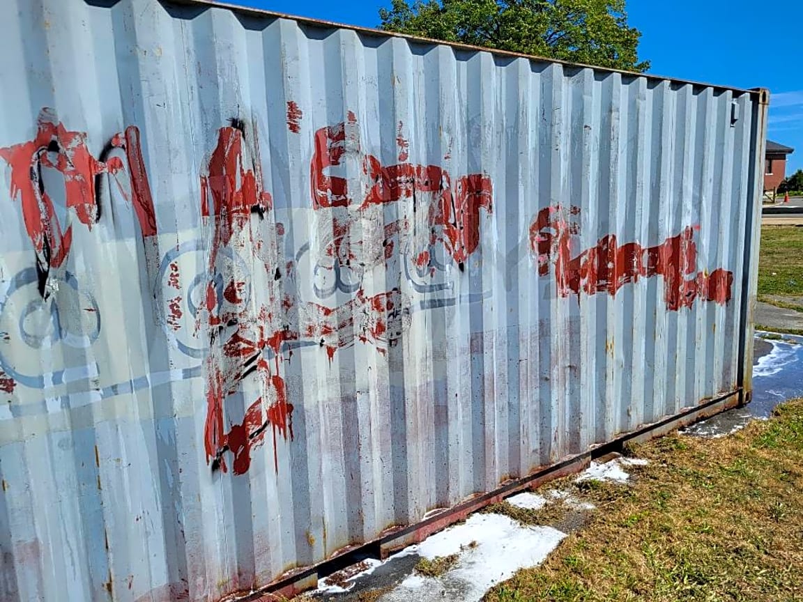 - Graffiti on container at the pickle ball court. Across from the water at DCR building