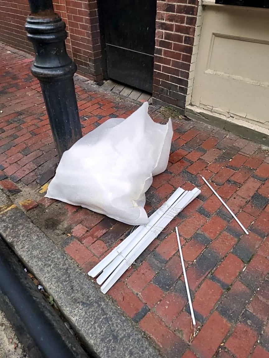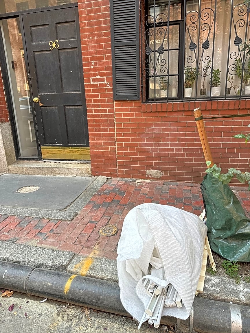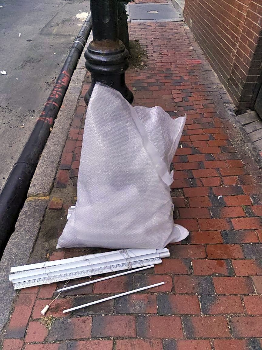 Noted. 1 bag of cardboard and plastic and miniblinds of the sidewalk, no evidence found and no citation was issued at this time and sent to dpw for removal.
