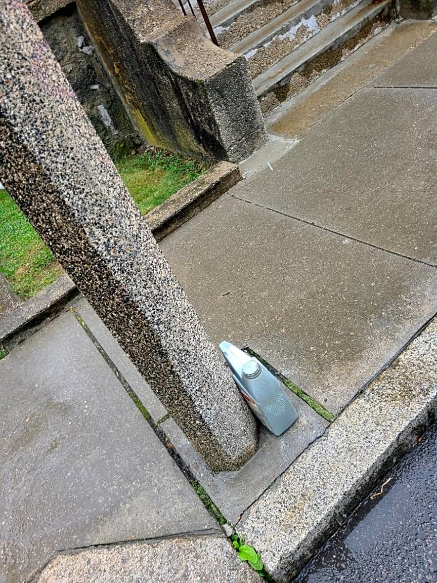- A grey containter with liquid that was left on the sidewalk a few days ago. | Witnessed incident: [No]