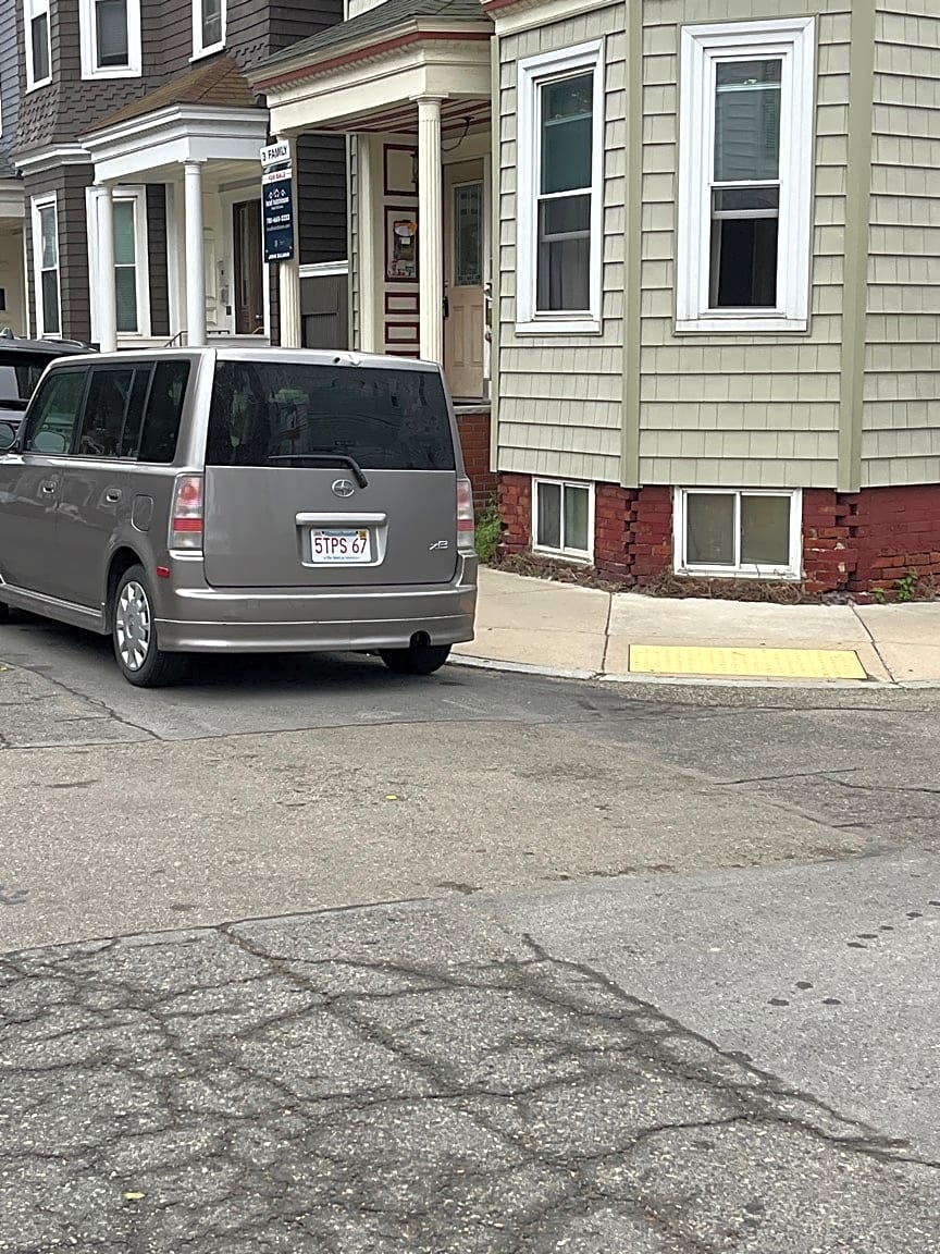 - 5TPS67 Grey Scion parked on a handicapped ramp . Please ticket