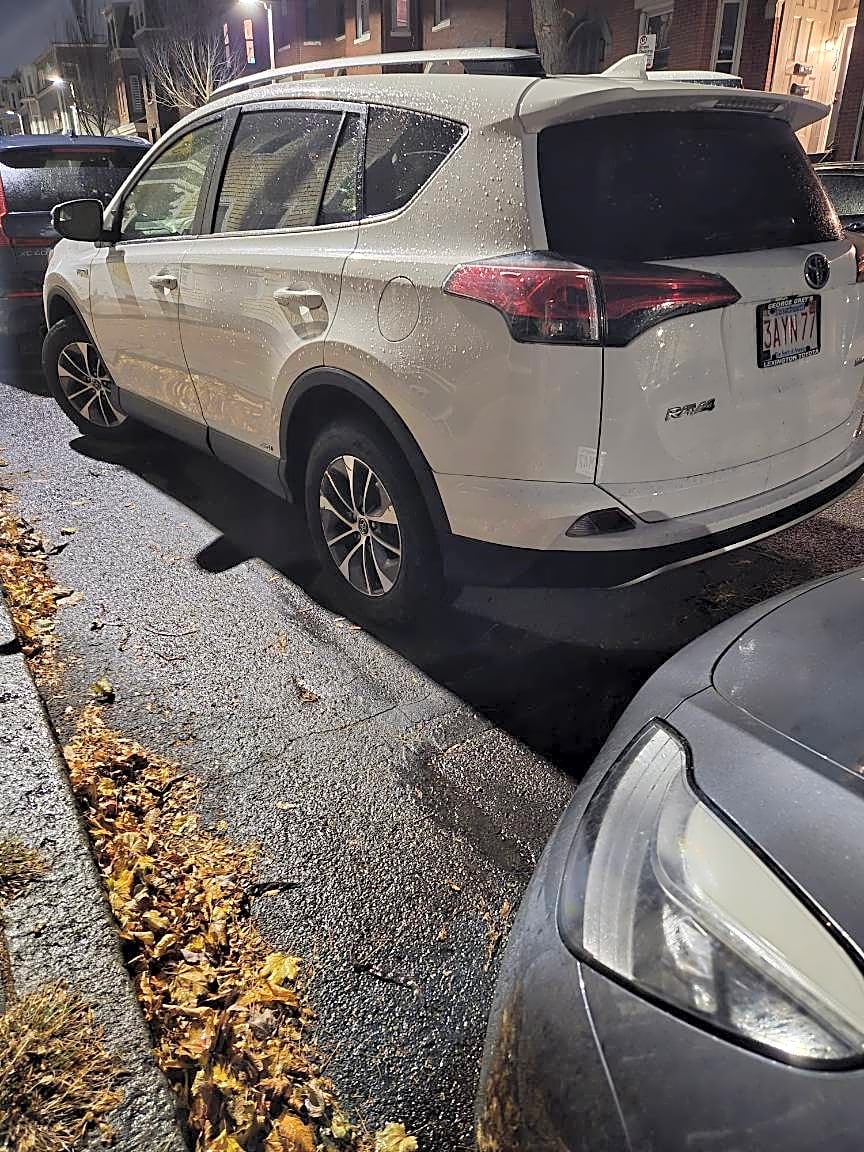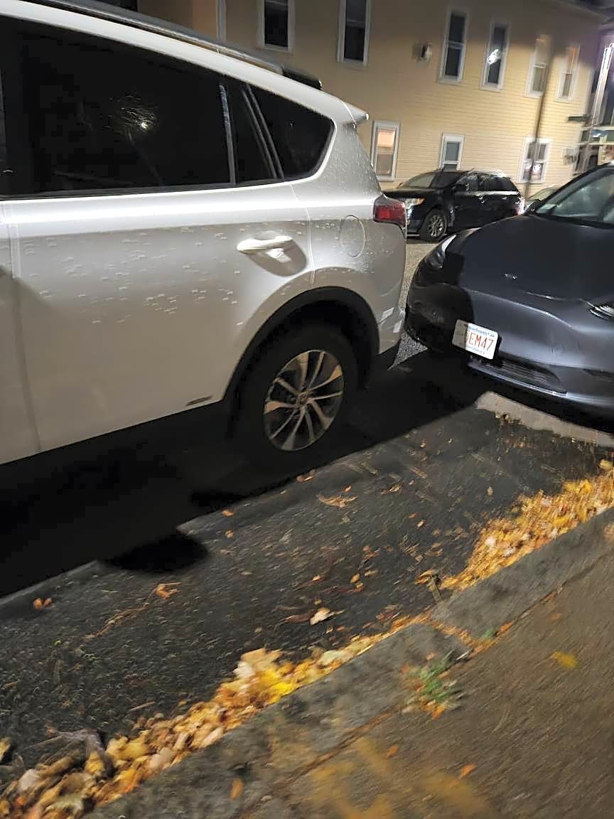 - Stopped vehicle improperly parked 5 feet from curb impeding traffic and impeding resident from exiting parking spot MA 3AYN77
