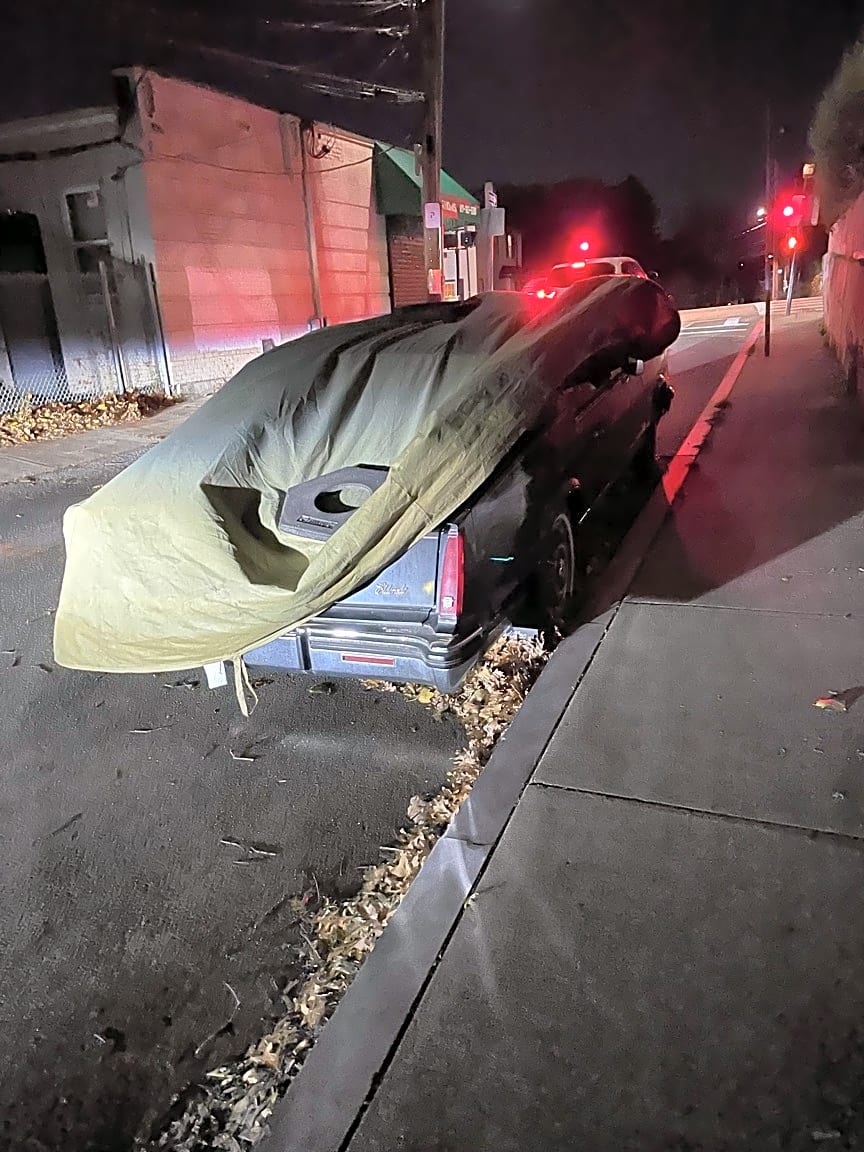 - Car with winter cover and flat tires with illegal parking cone in front on Sycamore Street just before intersection with Cummins Highway.