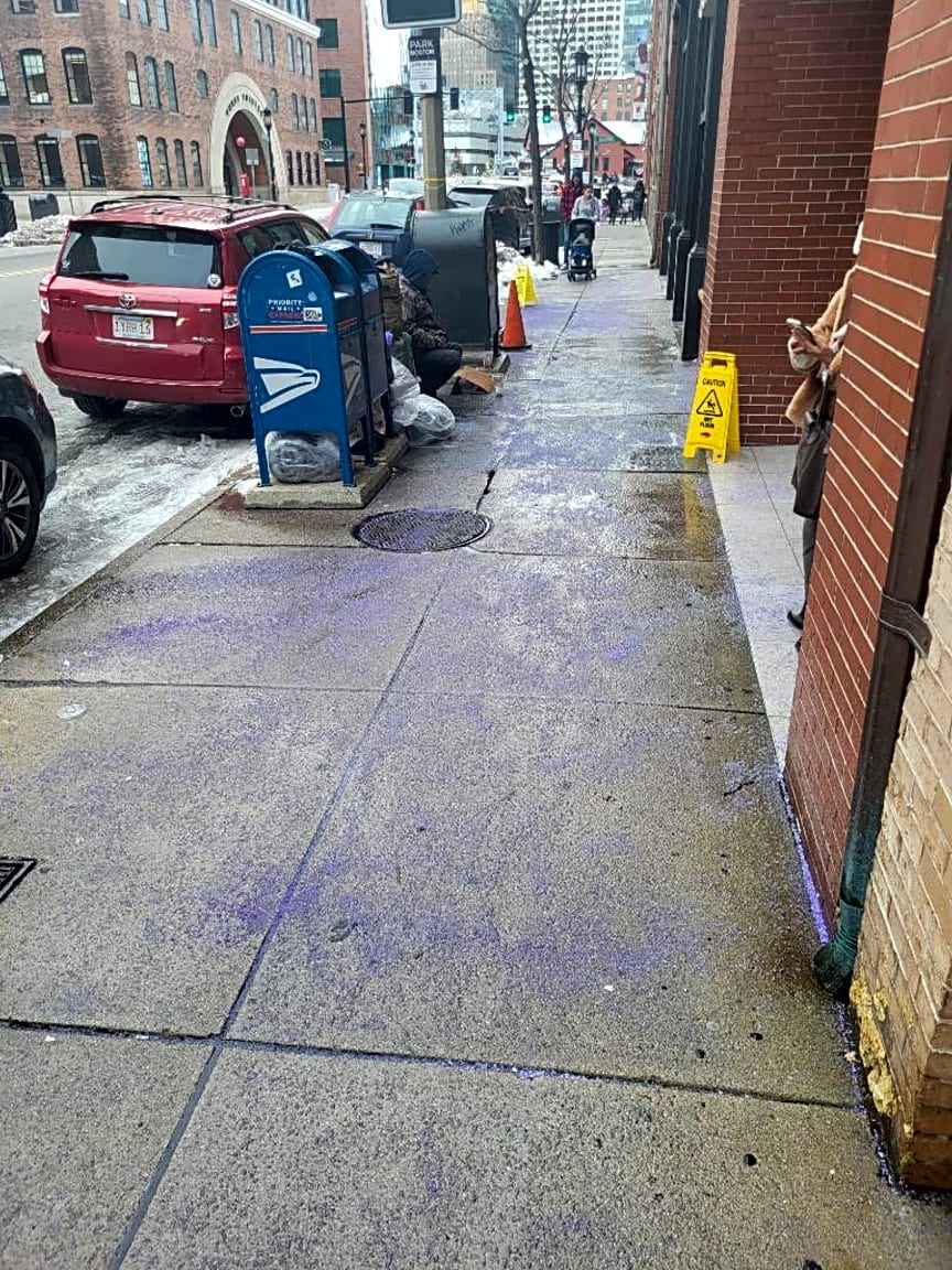 - The Dunkin next to 330 Congress Street in the Seaport has a sheet of ice in front of it. The roof drains directly onto the sidewalk which froze and creates a dangerous walking environment. There is no mitigation from either business, no shoveling, no salt, just a sheet of ice. There's an unhoused person who sometimes warns people that it is icy, but he wasn't there today. Please get this building to remove the ice from the sidewalk. I had to walk in the street to avoid the ice.
