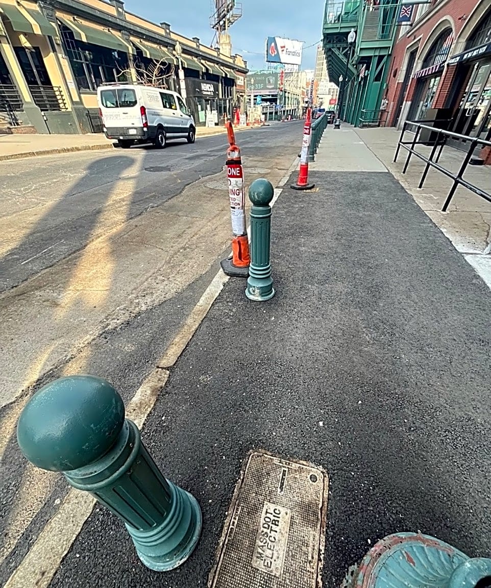 - McCourt construction forgot to put back all of the bollards after excavating. They put back a few but not all. Also the curbs they reset are not straight and broken badly.