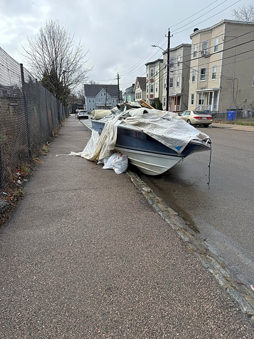 - Abandoned boats with trash. It was already tagged a month ago and it’s still here. | Make of the abandoned car: [UNKNOWN] Color of the abandoned car: [WHITE] License Plate number if available: [None]