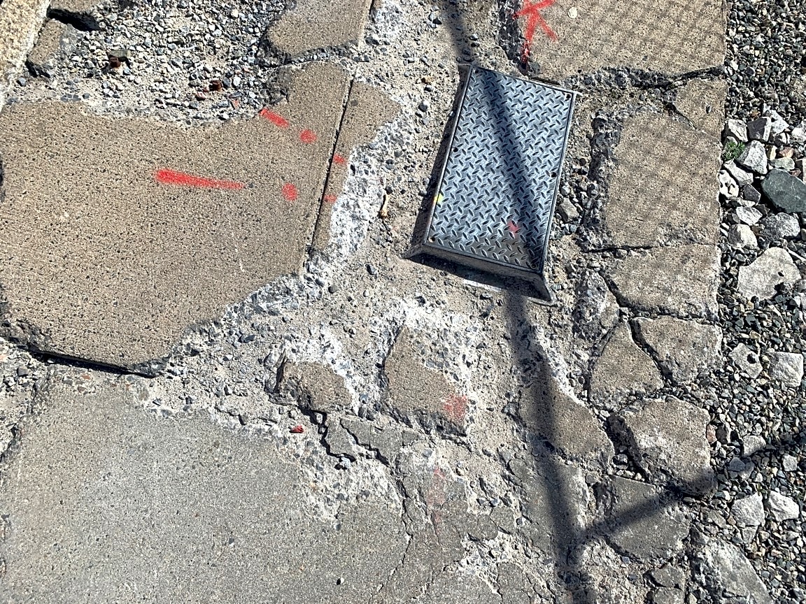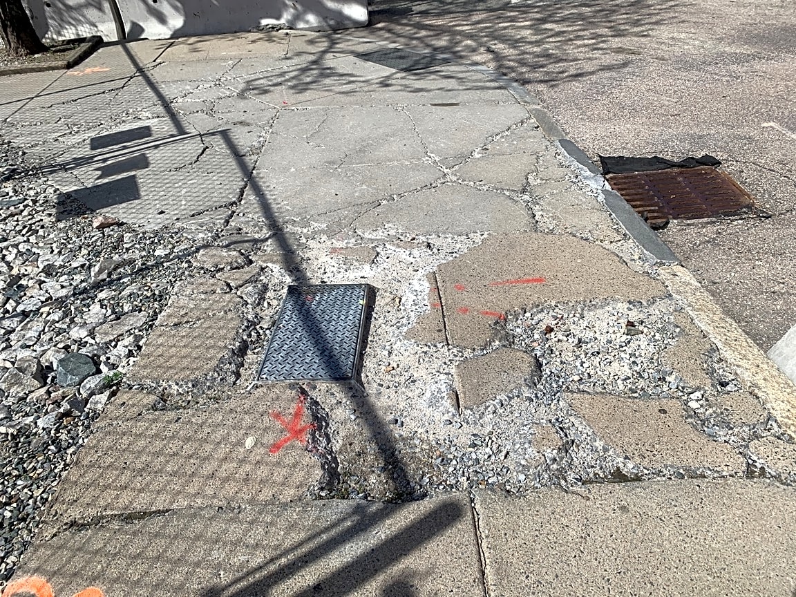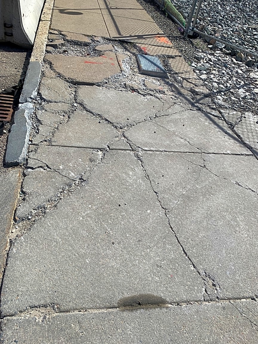 - broken, deteriorating crumbling sidewalk, uneven, dangerous (on frawley st)