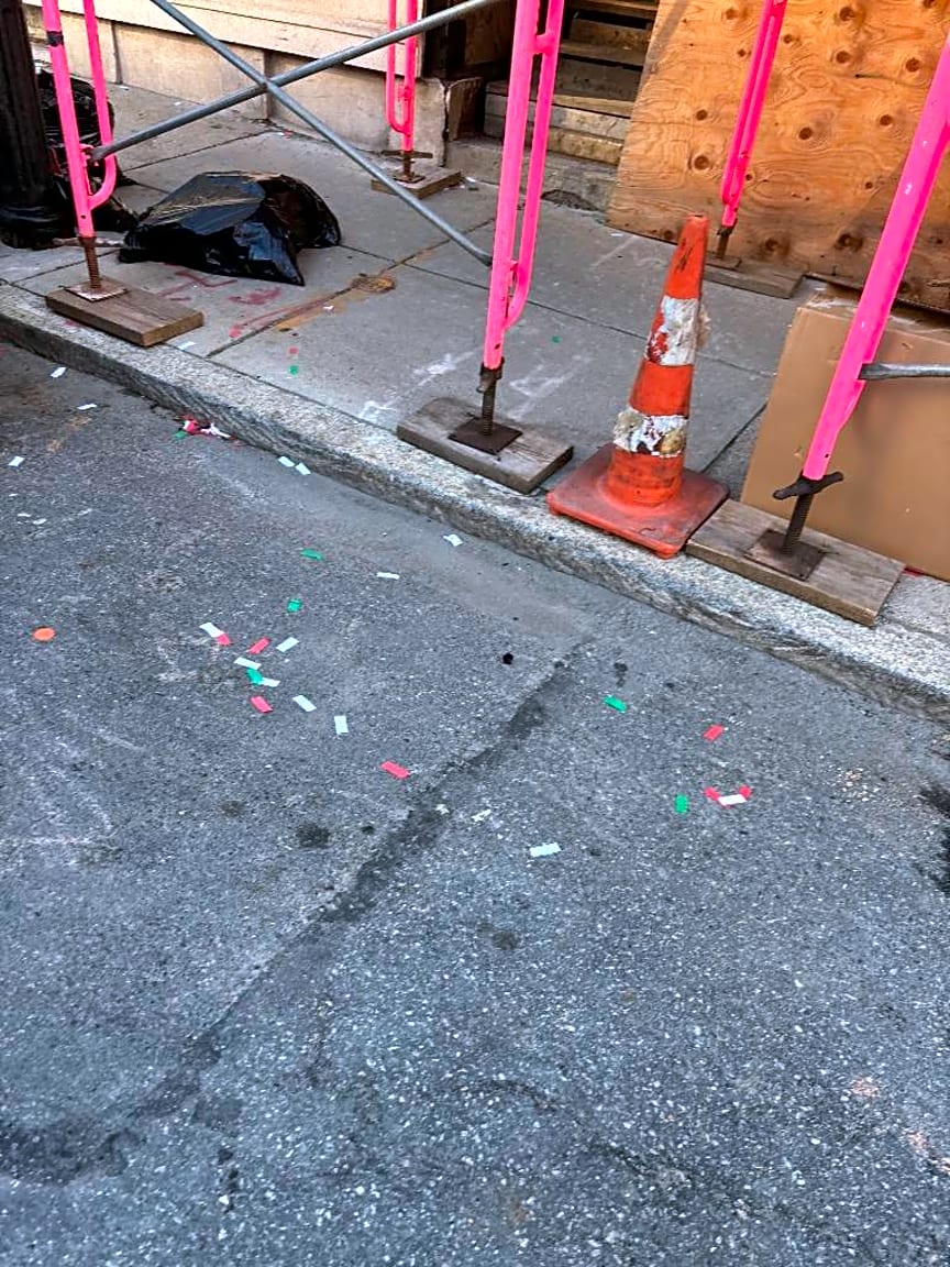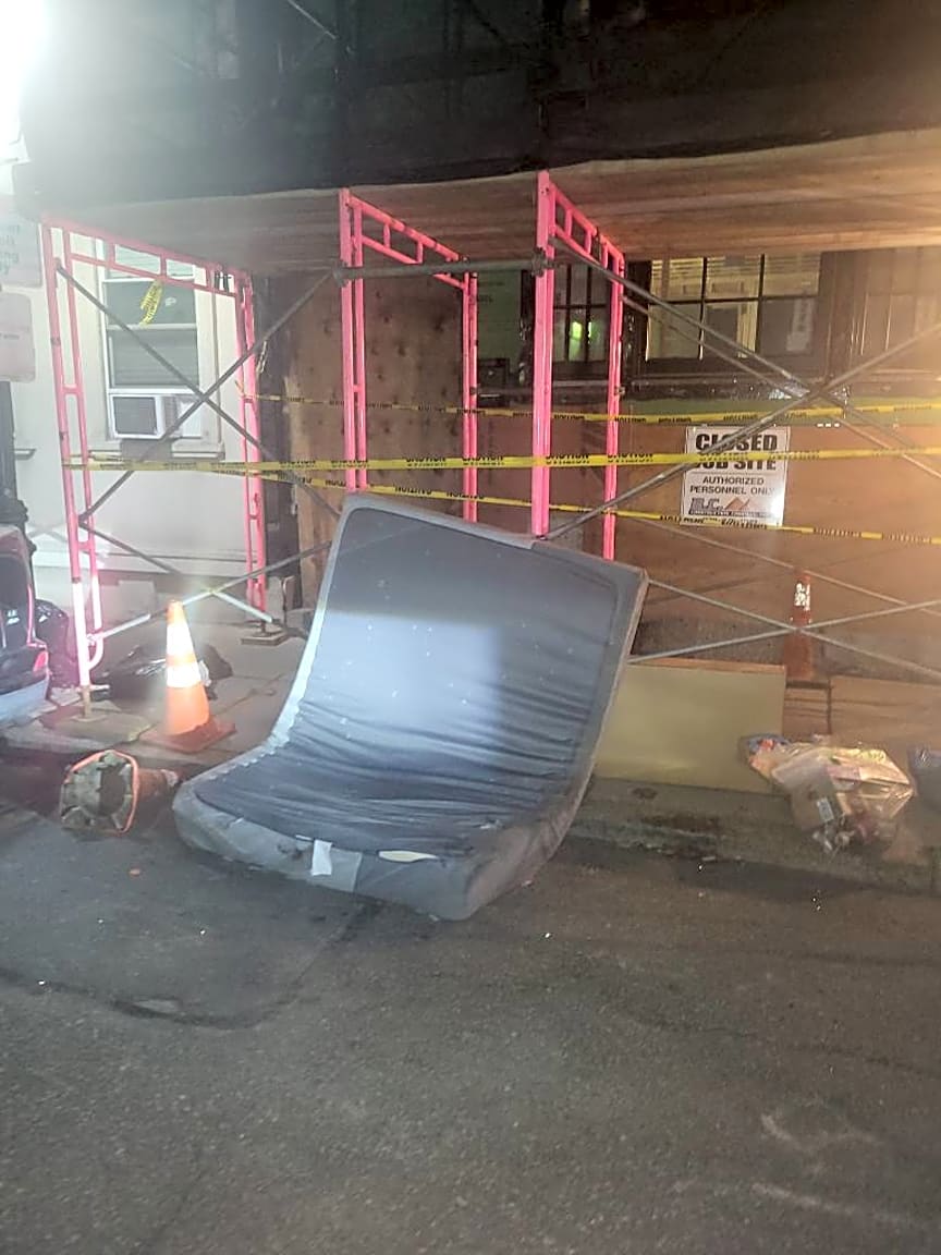 - Mattress left on sidewalk whew construction is already taking place so between the scaffolding and the mattress pedestrian access is very hard. Someone moved and left this mattress here. Can city please remove thank you.