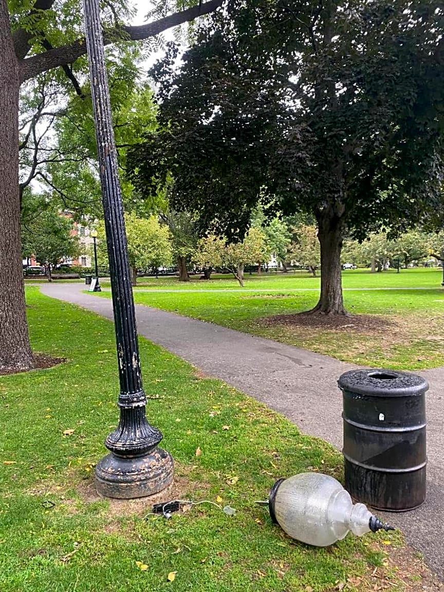 - Light fell off of pole in the Public Garden. The light will be stored in the Public Garden maintenance shed. Please consult the Parks staff there.