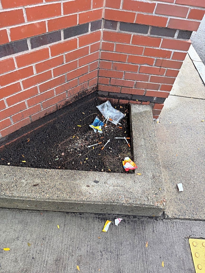 - 6+ needles in planter to building where children live. A few more down sidewalk