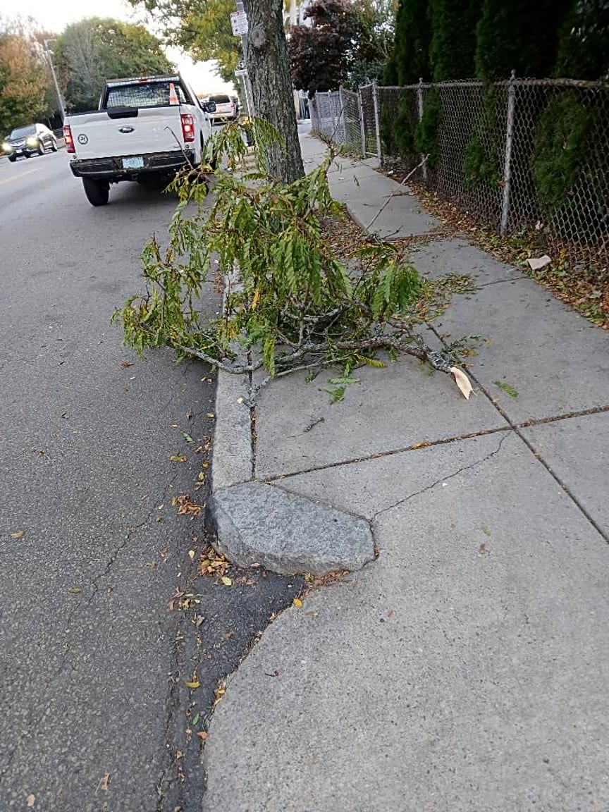- constitunet states there is a tree branch down on the sidewalk here. PARKS notified at 4:43PM | What public way is blocked: [Sidewalk] The police on the scene: [No] Type of blockage: [Branch] Limb/branch broken, but still attached to the tree: [No]
