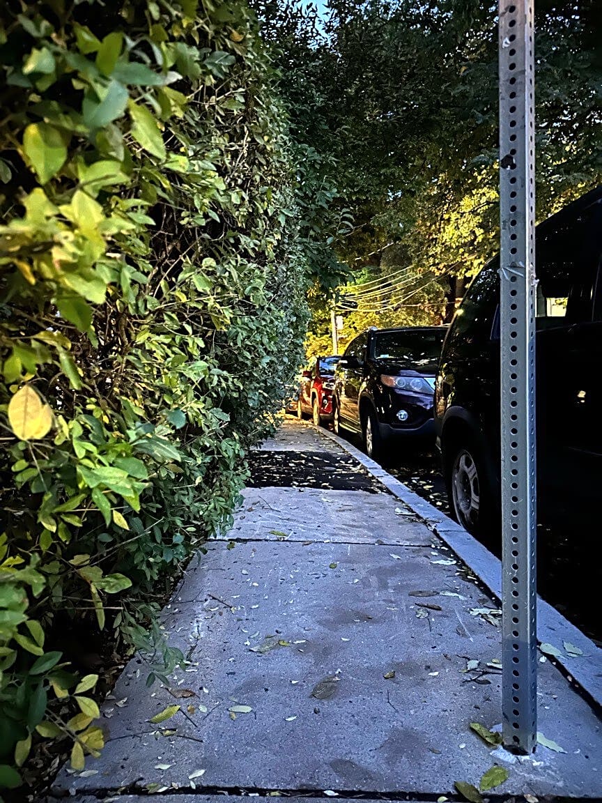 - Overgrown Bush Blocking Sidewalk Access at 65 Lanark Road. The sidewalk is obstructed by overgrown bushes. The path is too narrow for pedestrians, strollers, or wheelchairs to pass safely. The overgrowth forces people to step into the street, which is unsafe given nearby traffic and parked cars.