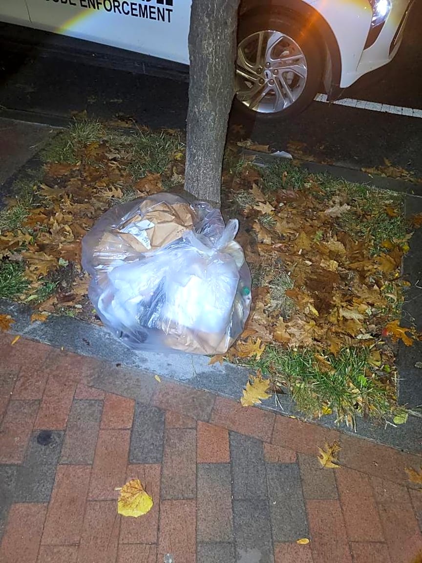 Noted. 1 bag of trash placed out early for collection, evidence was found inside and a citation was issued and was sent to dpw for removal.