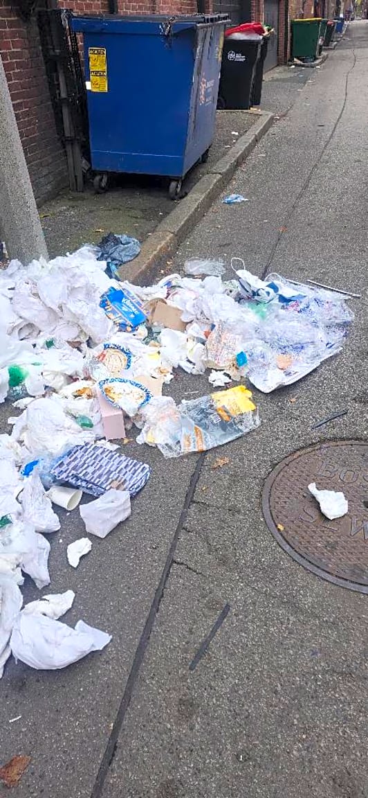 - Large amount of household garbage left where it should not be. Located in public alleyway 436. The rear of 75 Newbury street.