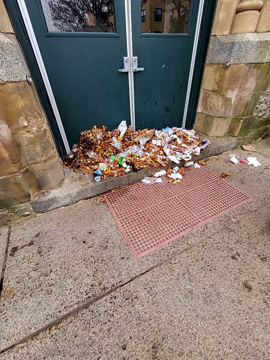 - St. Patrick’s Church on Dudley Street and Hampden Street. Pile of trash left in front of church looks very malicious needs cleanup fast.
