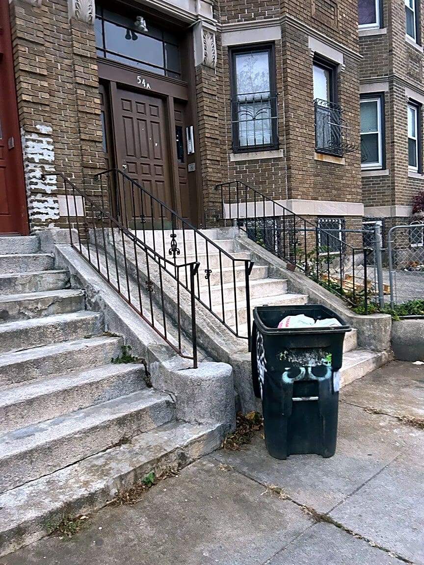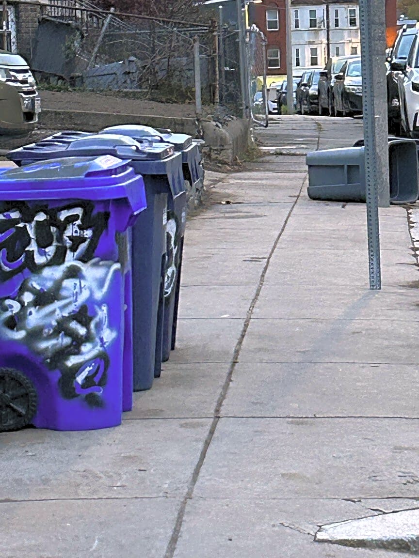 - Trash barrels on sidewalk blocking walkway 50, 52 Clifford Street after trash day on Friday and today is Wednesday.