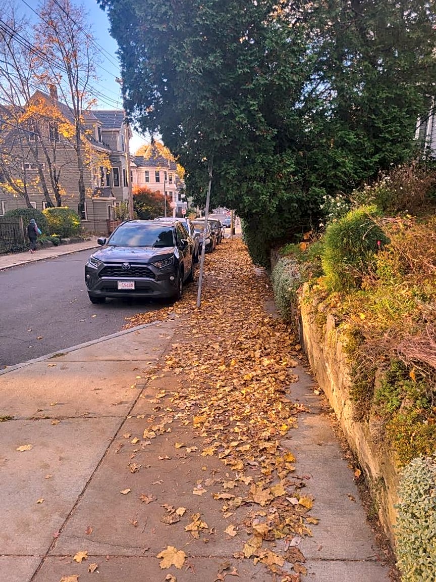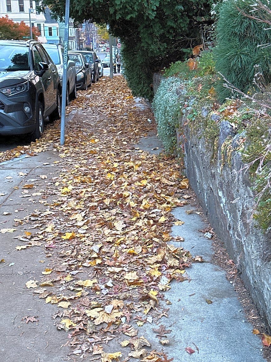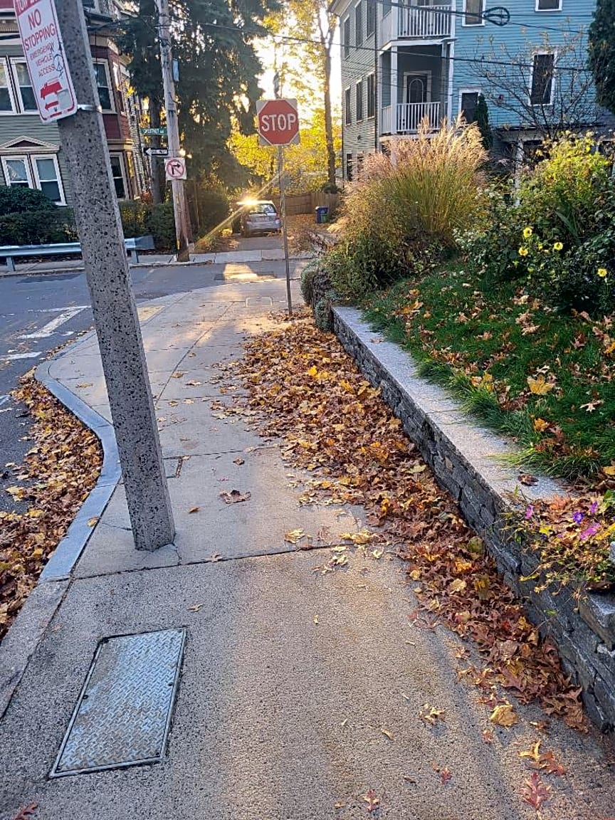 - Leaves blown from property onto sidewalk. This gets very slippery very slick when it gets wet and/or freezes