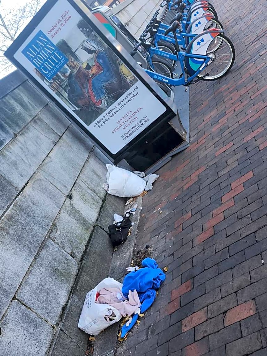 Noted. Bag and loose trash found dumped on sidewalk no evidence found unable to issue citation sent to dpw for removal.