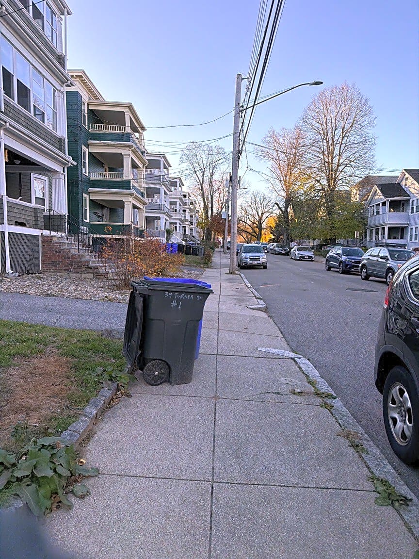 Resolved. Residents have 24 hrs after pickup to remove barrels from sidewalk. Will allow time for barrels to be removed from sidewalk.
