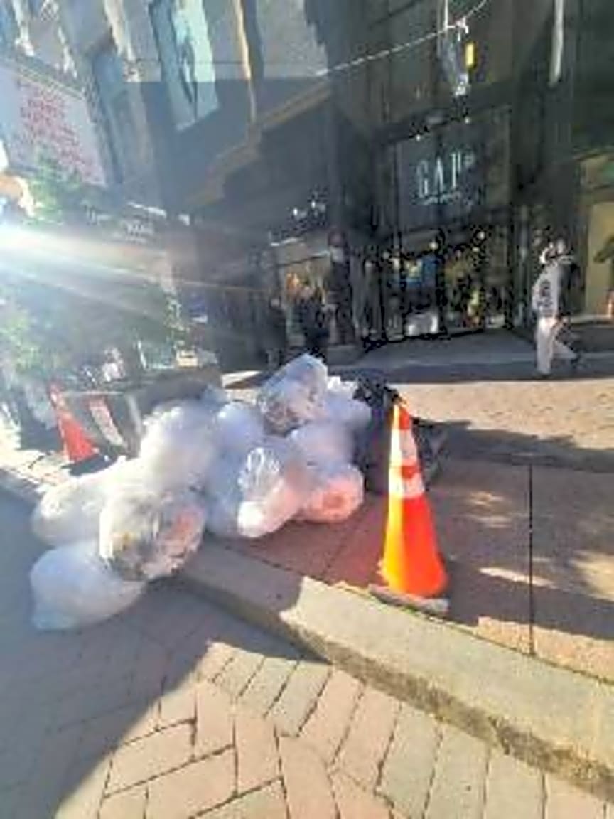 - Illegal recycling trash bags left out in front of 411 Washington Street at the GAP store. About 15-20 bags.