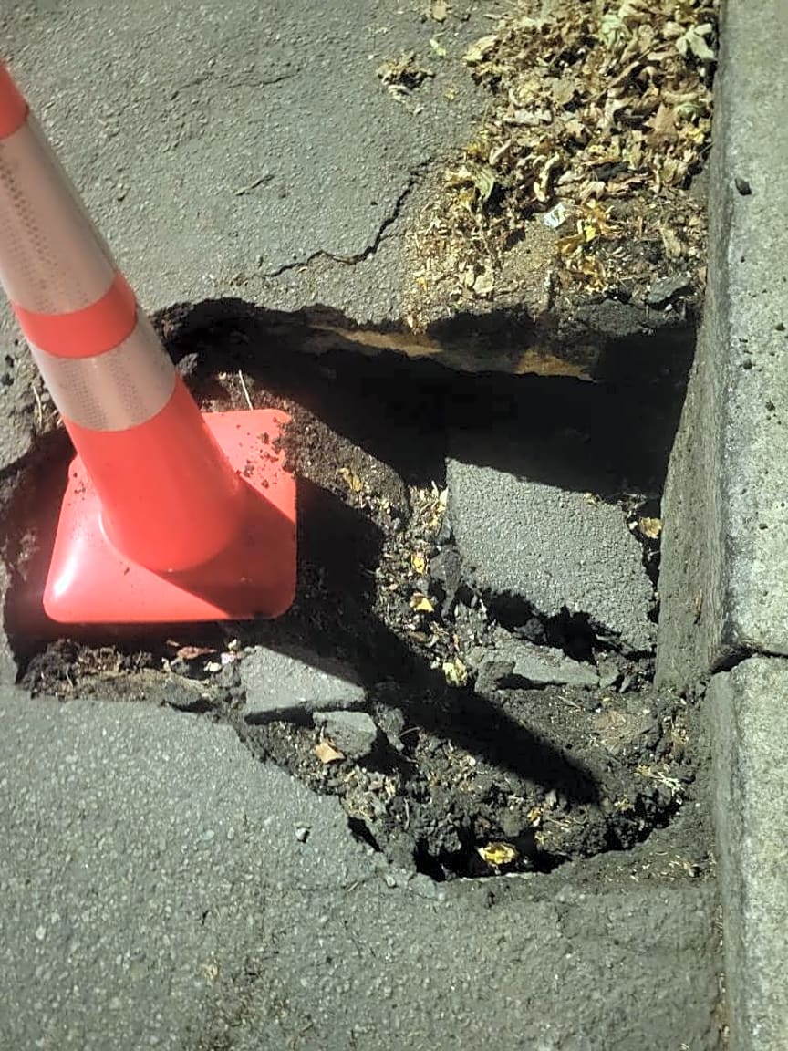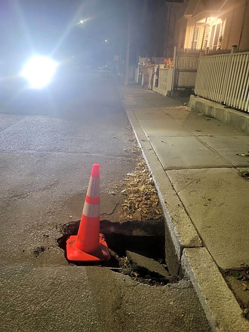- 3x3ft sinkhole starting to collapse. Constituent reports that a large hole is forming on their street is 3 ft. deep and requests immediate assistance. PWD radioed at 12:42PM | Where exactly on the pavement is the pothole: [On Roadway] What is the approximate size of the pothole: [3x3ft] Date when pothole noticed: [11/18/2025]