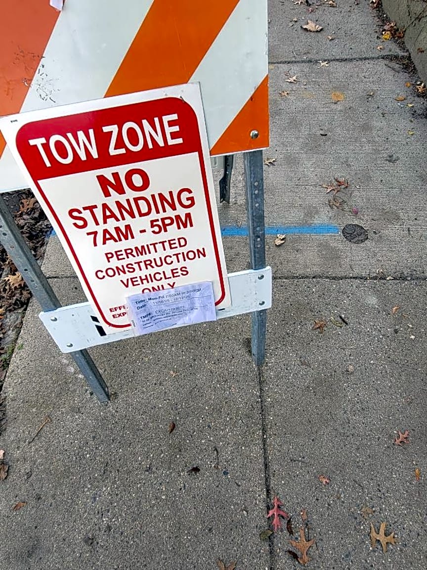 - there is rodework being down, the bird is right by the orange tow zone sign | Dead animal on sidewalk/roadway: [Sidewalk] Type of animal: [Bird] Date when animal seen: [11/20/2025] Time when animal seen: [09:25]