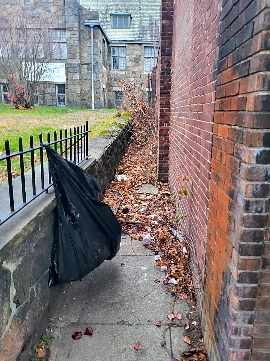 - Trash bags left between the church at the corner of maple st and store on river Street