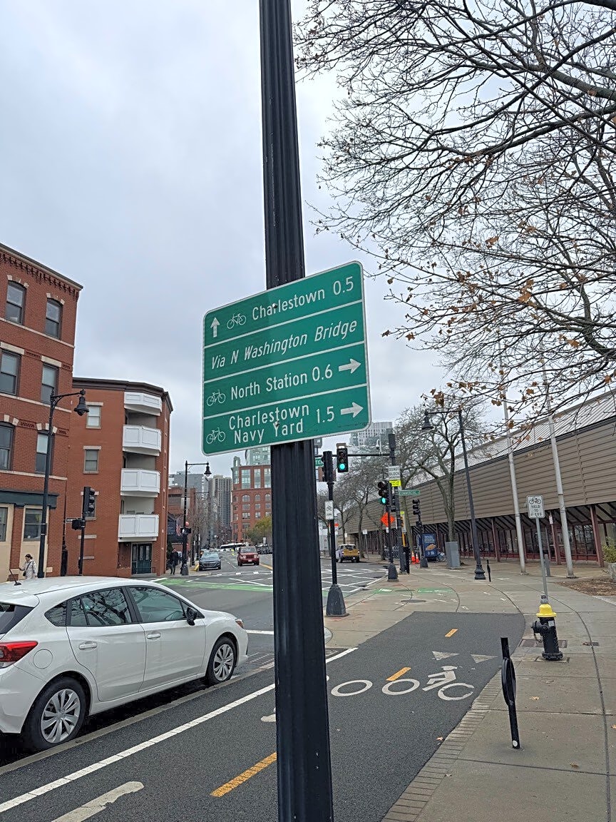 - This sign is incorrect, and really can’t be fixed. It should be removed, or at least partially blacked (greened?) out. Charlestown is to the right, not straight. North Station is straight, not to the right.