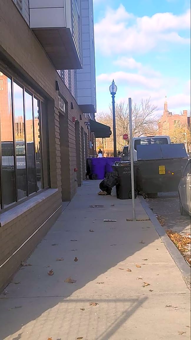 - Other | Details: [Correct address is 11 E Lenox. Dumpster blocking the sidewalk and trash blowing everywhere]
