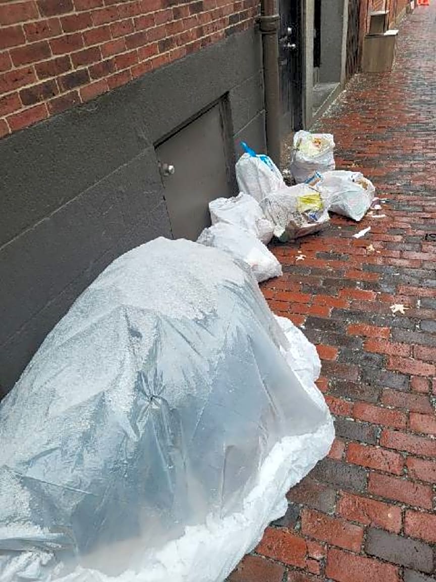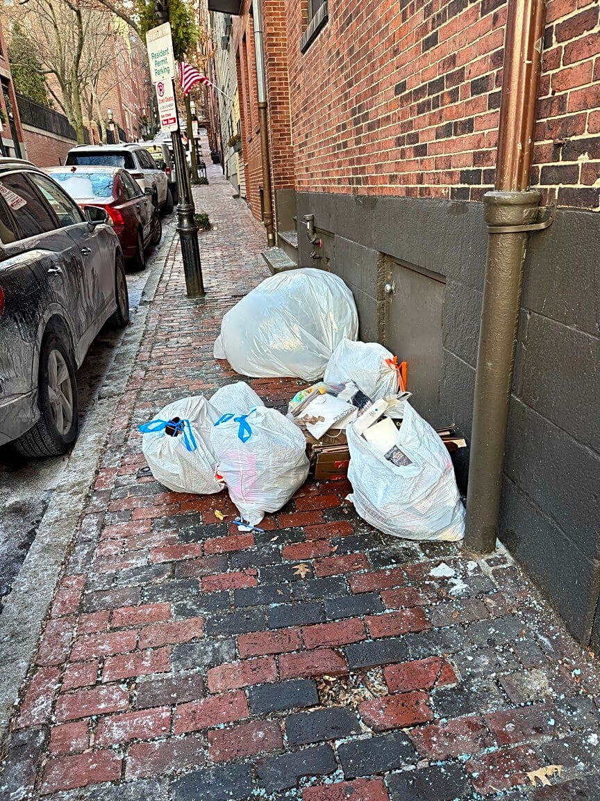 - Many bags of trash, some ripped open, out illegally and blocking sidewalk at 11 South Russell Street.