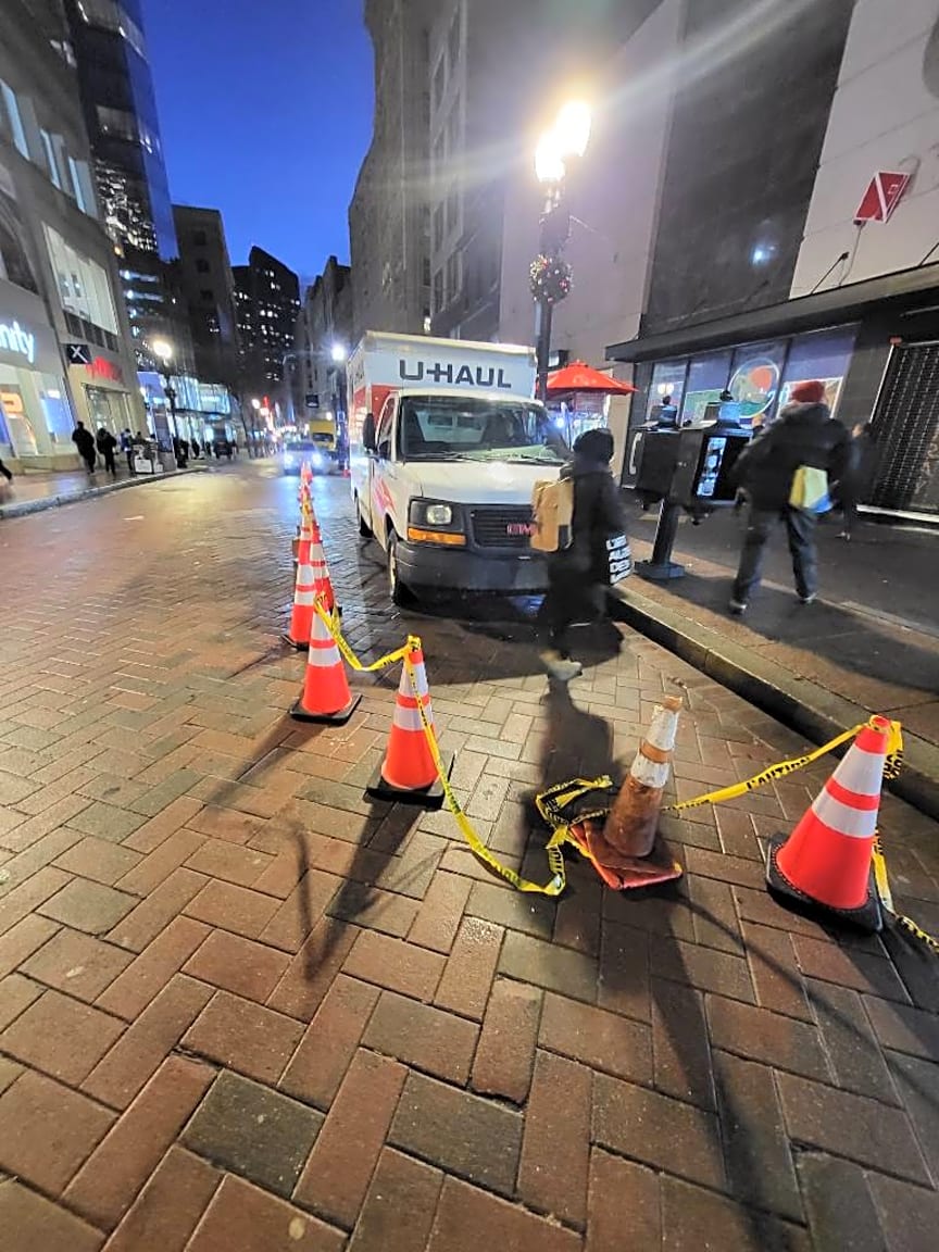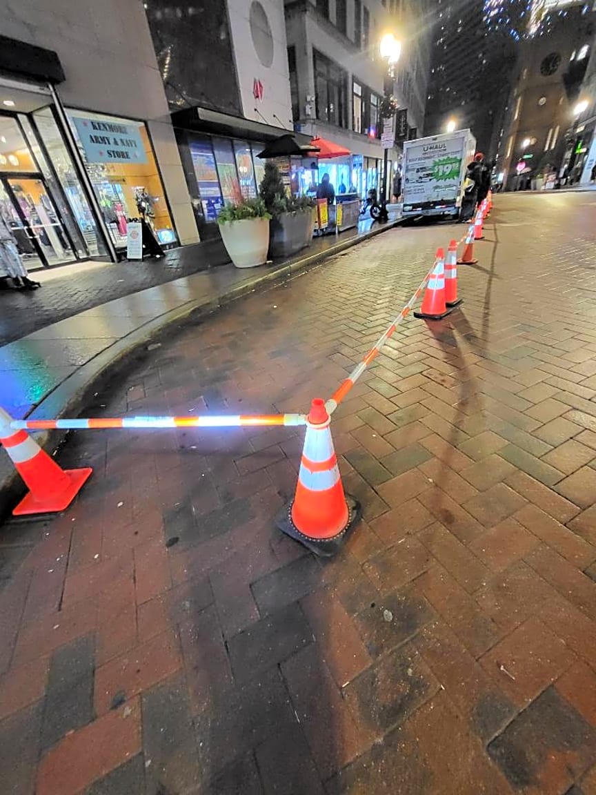 - Day 2 the extended blocking off the street with no permitting .. can enforcement please come remove these cones to save an argument please.. its right down the street from city hall 350 Washington st
