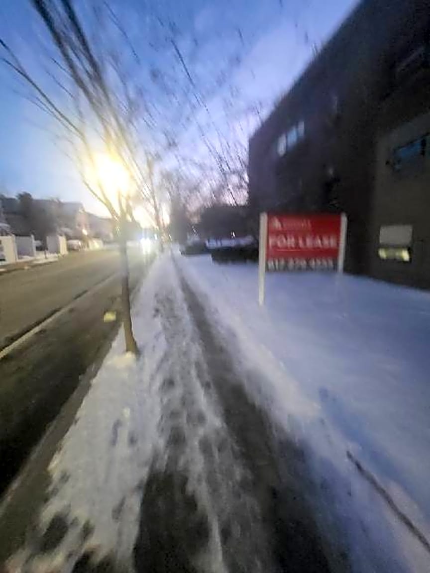- Unshoveled sidewalk next to senior living apartments. The sidewalk is nearly solid ice, between the apartments and the grocery store. Very dangerous.