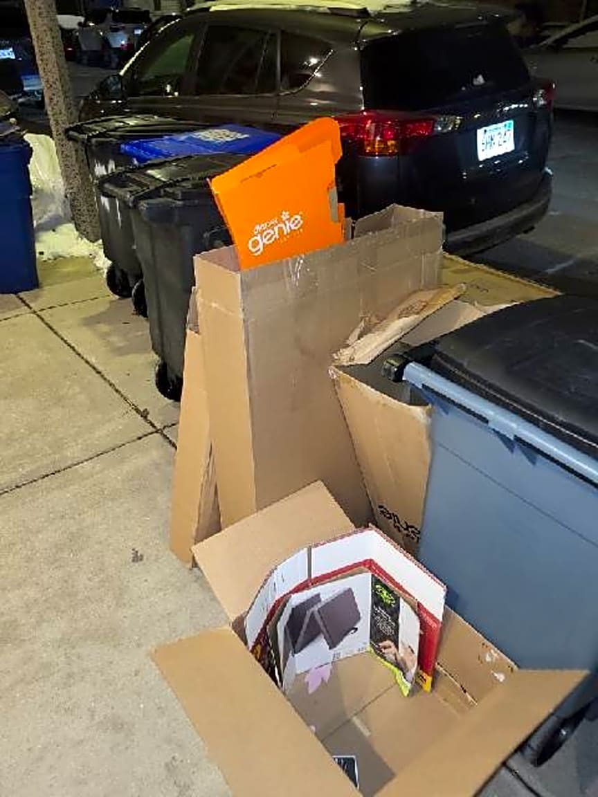- Loose box put out for trash, plastic inside box went all over the entire neighborhood. 186 Havre St