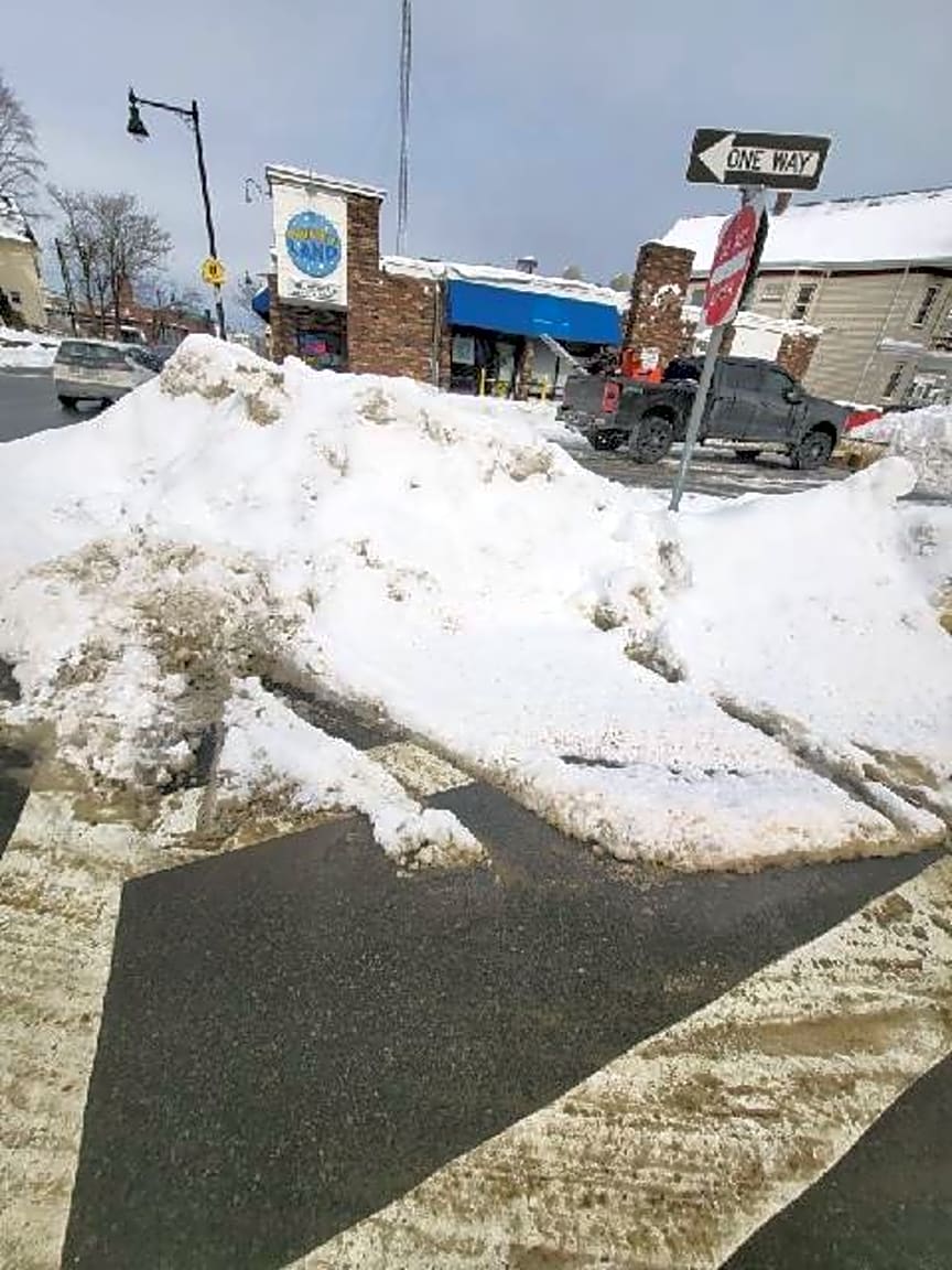 - Both crosswalks at this commercial property are blocked by huge piles of snow.