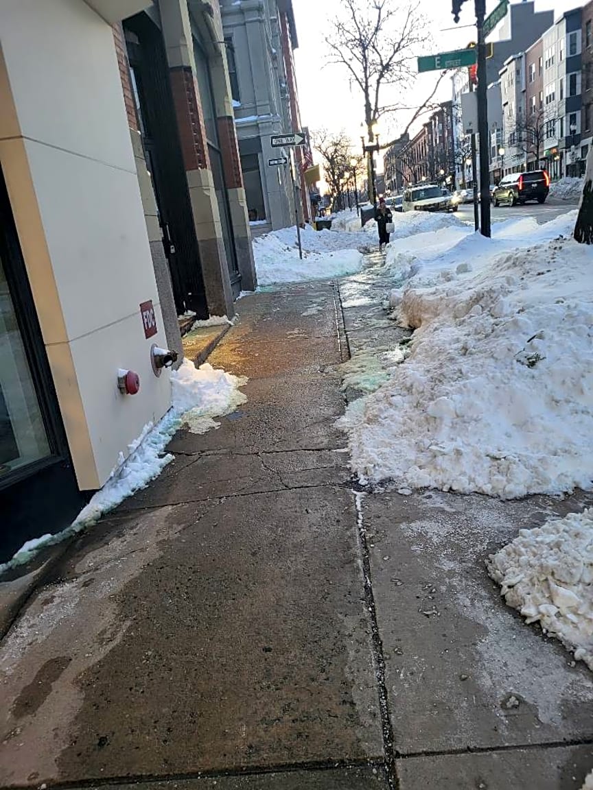 - Municipal parking lot is not shoveled. | Unshovelled location: [Sidewalk] City Owned: [Yes] Agency Name: [BTD] Exact location: [Parking lot curbside sidewalk on W broadway]