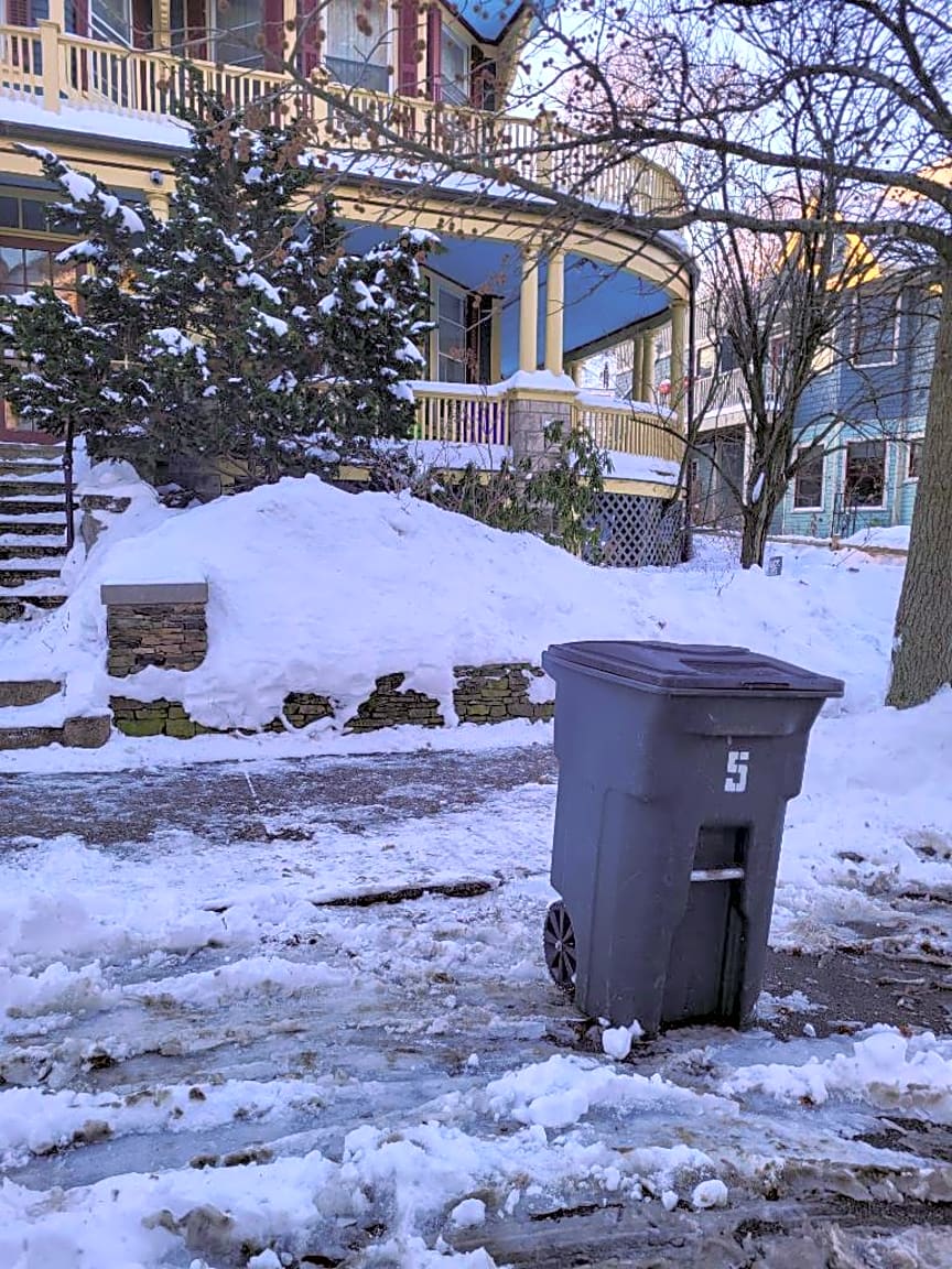 - trash barrel out belonging to unit 5 of 89 lyndhurst st, barrel is marked.