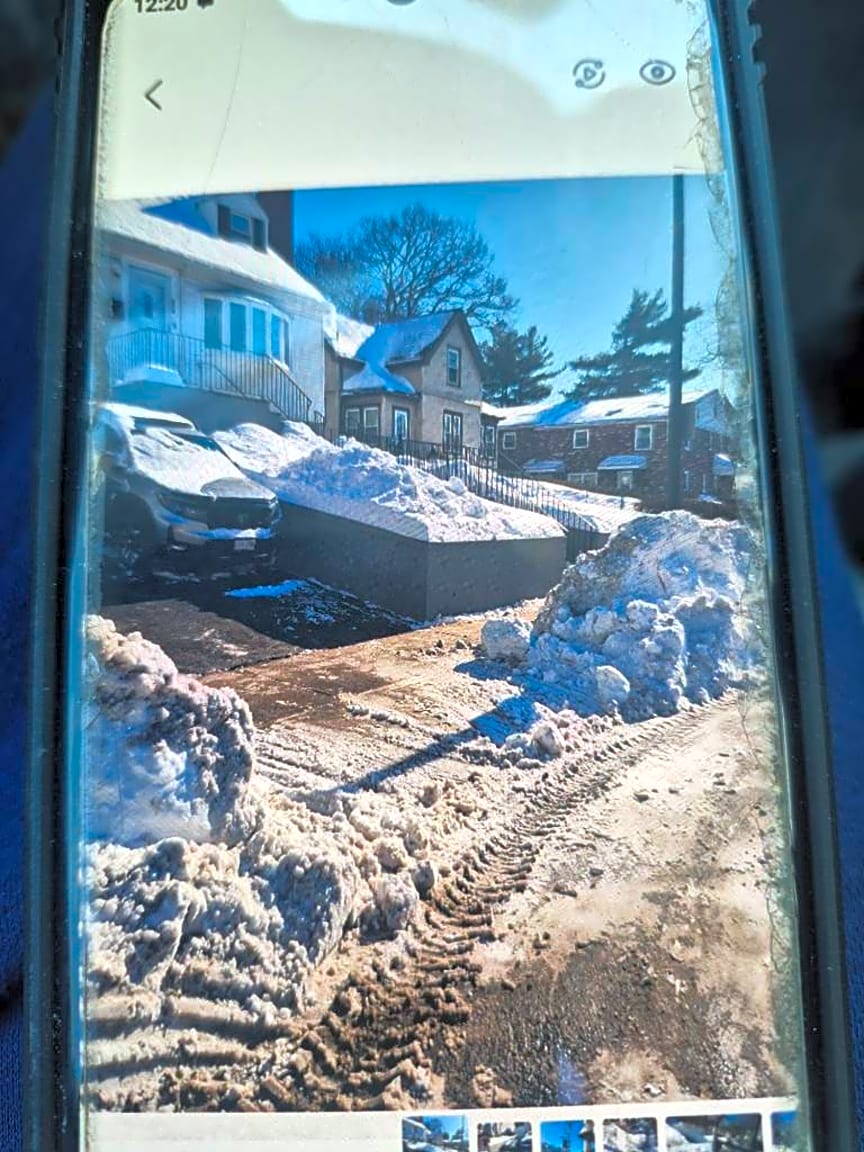 - Plowing not needed; Const. reports that after plows pushed snow back onto sidewalks/driveways from snowbanks, they left large snow boulders in these places. const. reports that a city vehicle cleaned the sidewalks for every other home on the street to remove these but missed her at. const. reports she cannot get out of her driveway. Natalie at 617-3232-468 |
