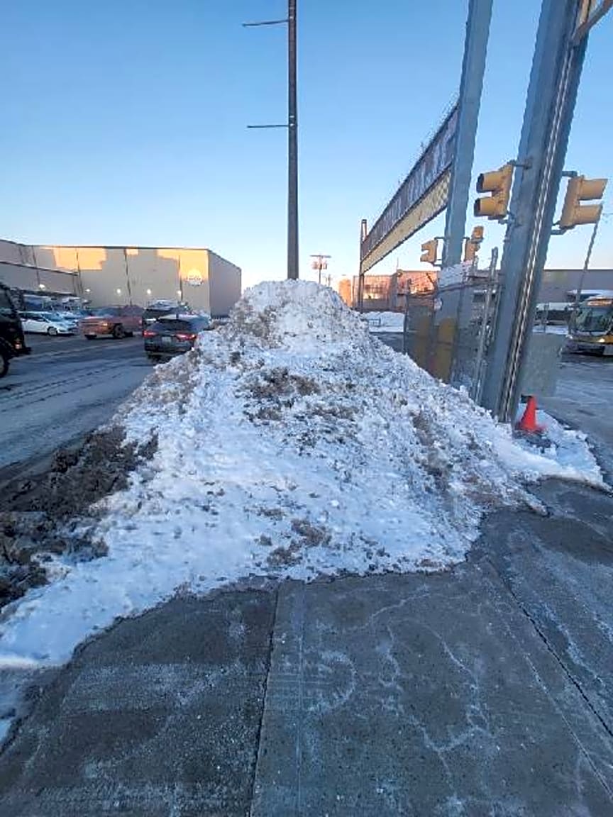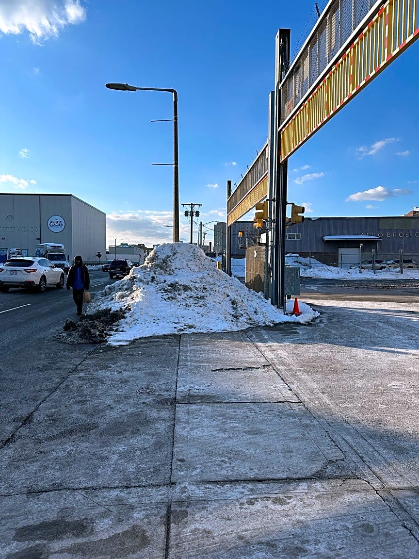 - Snow bank blocking public sidewalk. Pedestrians must enter street to pass and cars are obstructed coming from east.