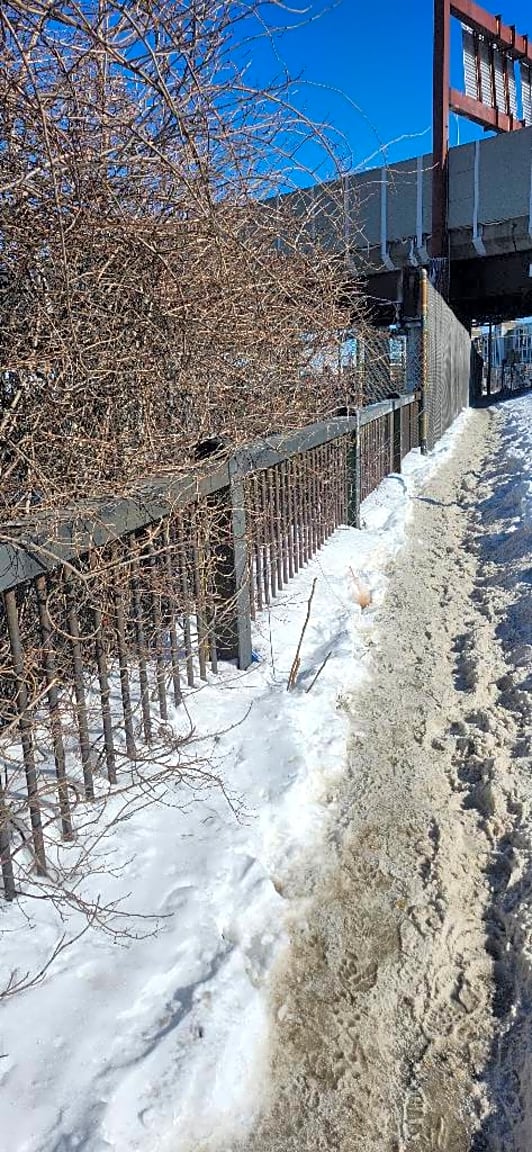 - Sidewalk over bridge on west side of 93 by Sullivan station has not been touched by a shovel since the storm.