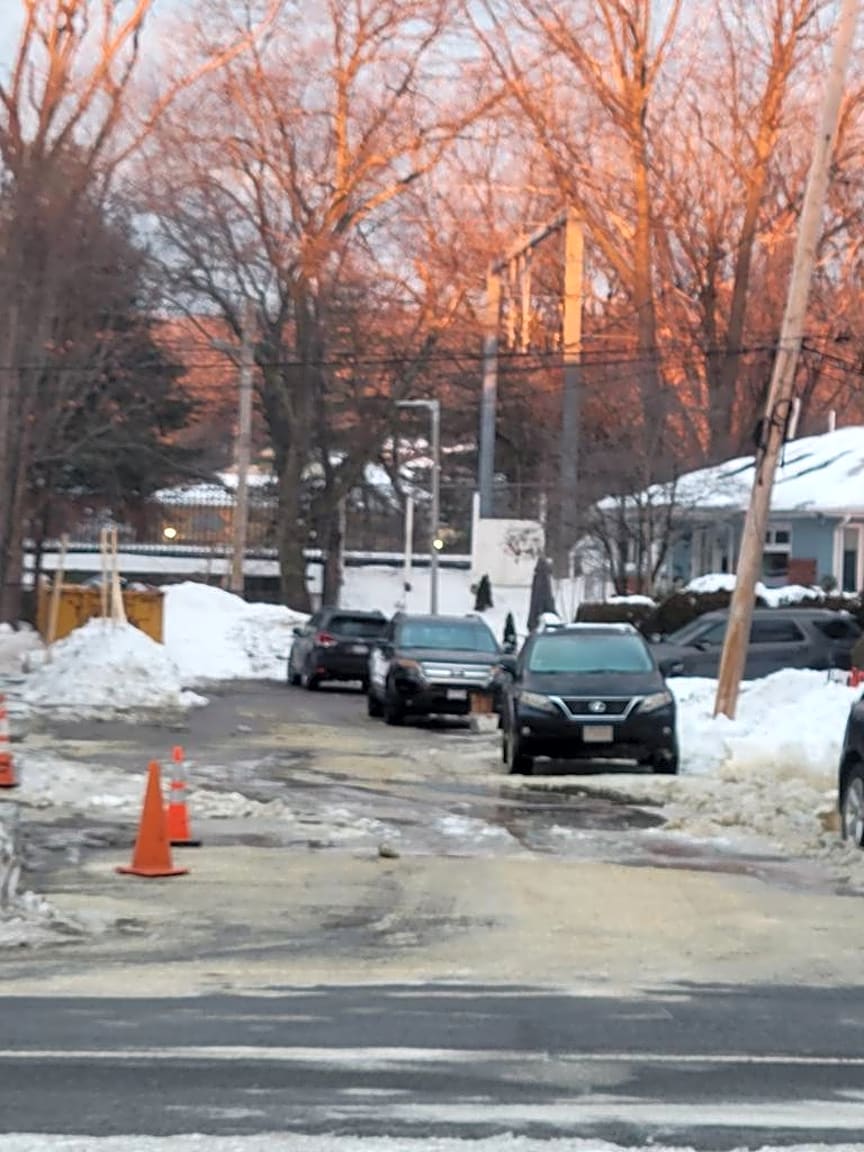 - water main break caused lots of water to freeze over and sidewalk and parking spots are all frozen and dangerous |