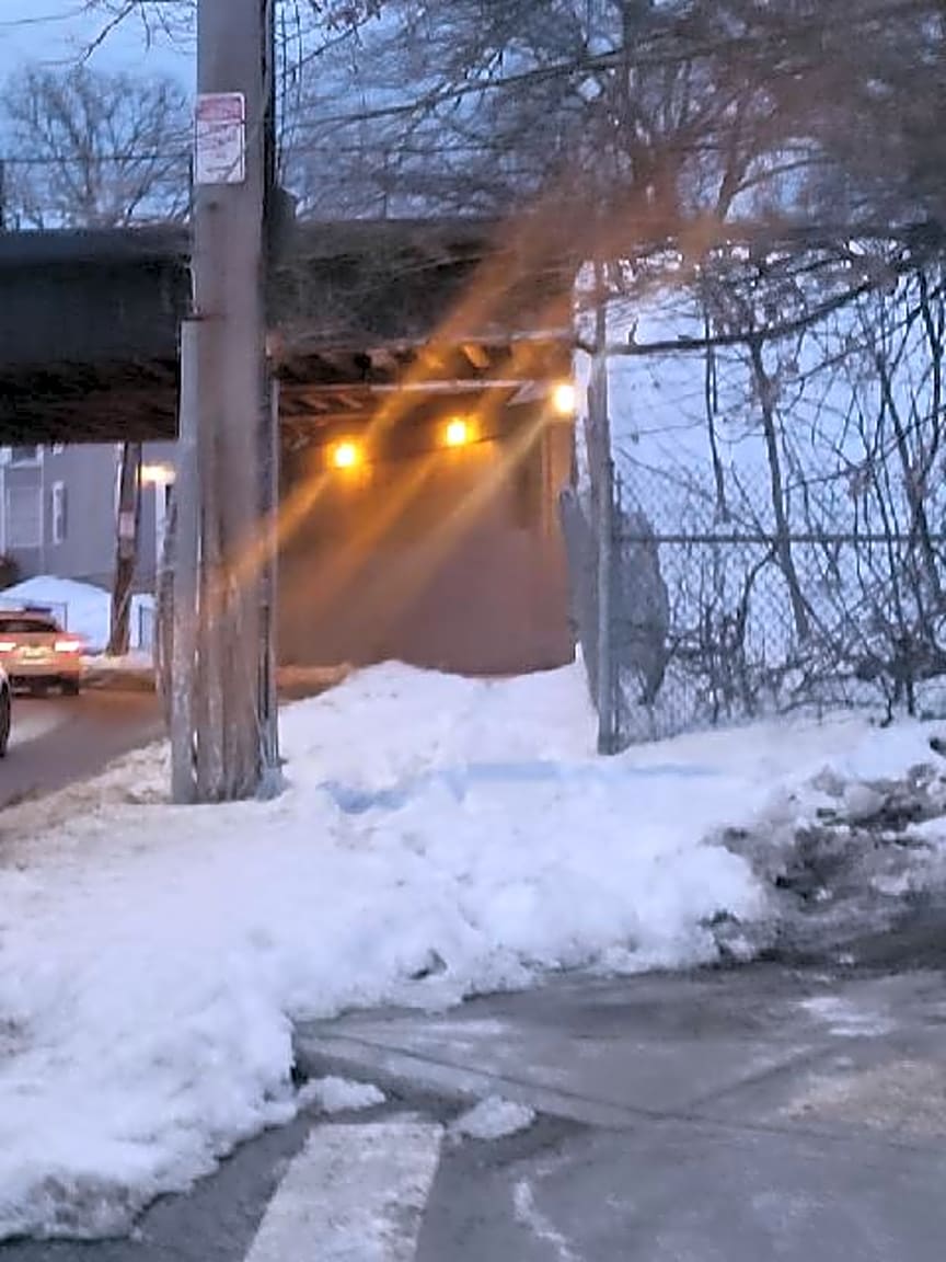 - I have reported this multiple times, just took this pic, there is no lighting under bridge & it remains unshoveled. We need to safely get to the pathetic train, it’s been 2 weeks