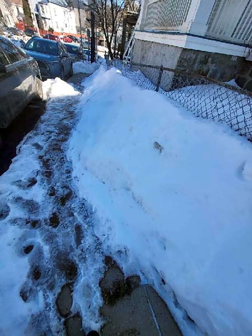- Sidewalk not shoveled. Salt, sand or cleared path is needed. Space saver also blocks sidewalk