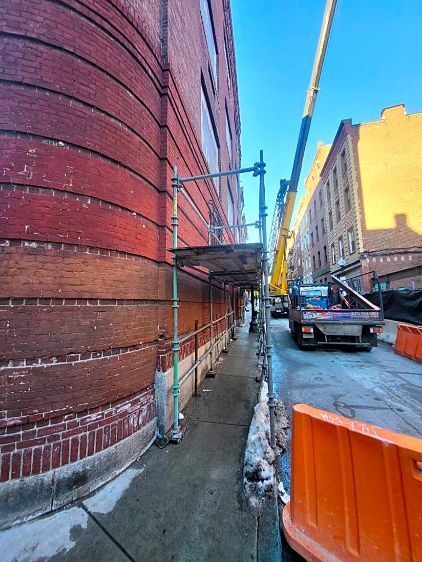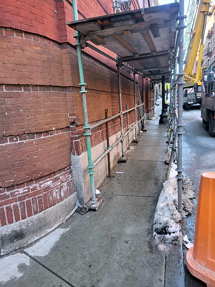 - Under the scaffolding it’s too narrow to walk between light pole and chain link fence. The fence seems to be sliding into the sidewalk and has sharp pieces sticking out - I always catch my stroller on it.