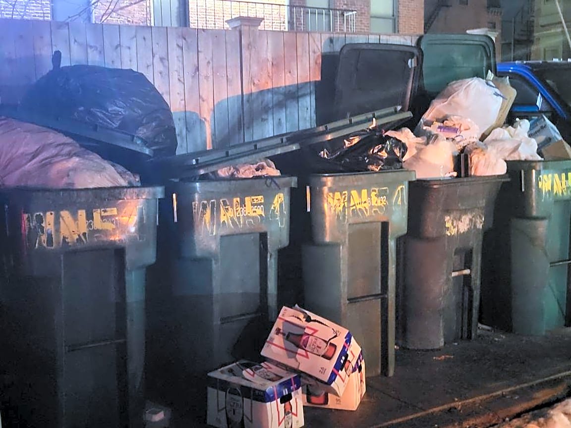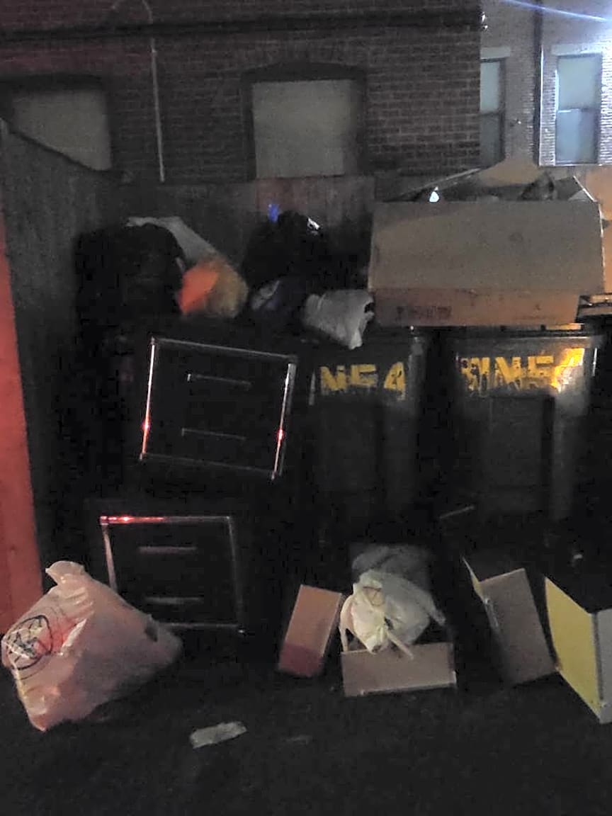 - Overflowing trash bins behind 102 W Newton in the Alley of W Haven