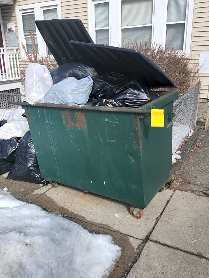 Noted. The dumpster needs to be off curb. We do not service on sidewalks. Also wheel is broken. If you have a issue with the wheel please contact contractor 617-569-1718. We also alerted contractor about issue. 617-308-9815 for more info. Sorry for the inconvenience.
