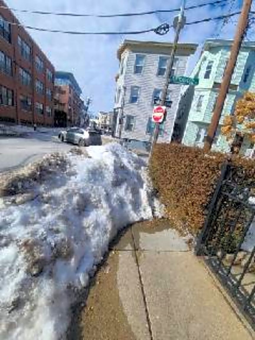 - Sidewalk is still unshoveled for over three weeks, forcing pedestrians into the street.