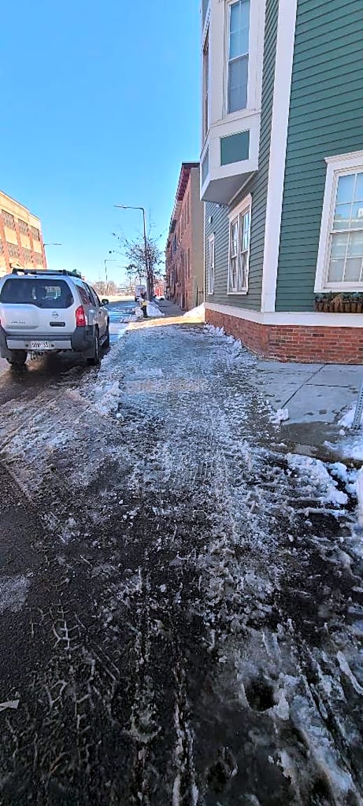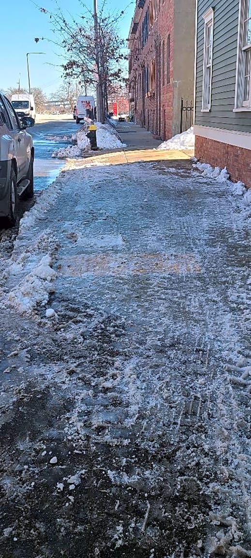 - Sheet of ice reportedly covering yellow handicap bump stripe. Slippery, dangerous. Street is on a steep incline. |