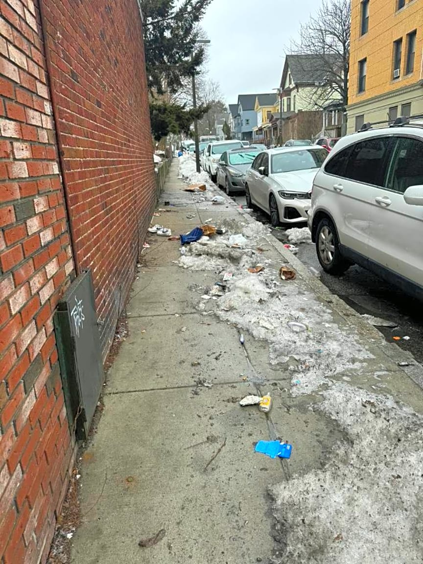 - report of trash spread on the sidewalk after a trash bag was ripped. pwd radioed at 10:24am | Type of debris: [Debris Pickup] Cars parked on the street: [No]