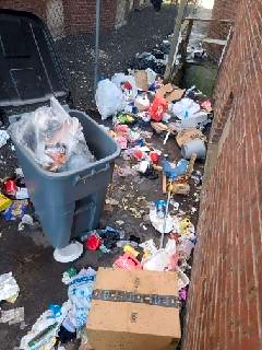 - Rubbish is placed out in unsuitable container | Details: [Overflowing trash barrels and bags of trash on side of building] Exact location: [Side of property]