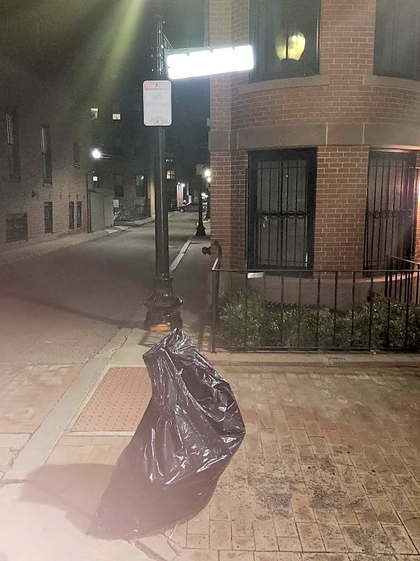 Noted. Bag found dumped on sidewalk no evidence found unable to issue citation sent to dpw for removal.
